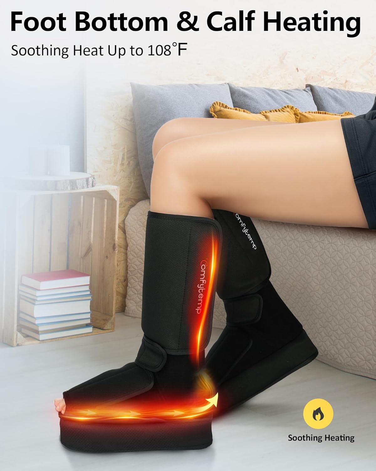Adjustable Fit & Soothing Heat: This cordless foot and leg massager offers soothing heat up to 108℉ at the soles and back of the calves to help relieve muscle fatigue rather than providing intense heat therapy. Maximum Instep Length: 14.4″; Maximum Calf Circumference: 21″; Sole Length: 11″; Boot Height: 14.8″, the fit may vary depending on individual body proportions.