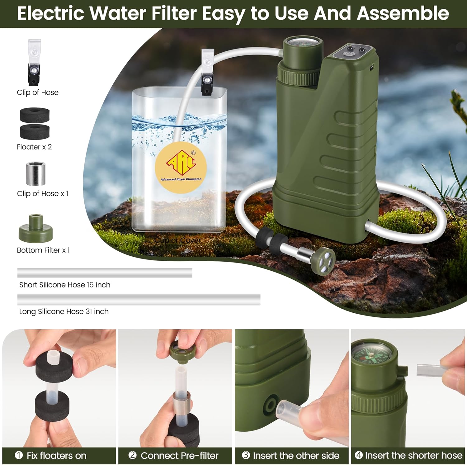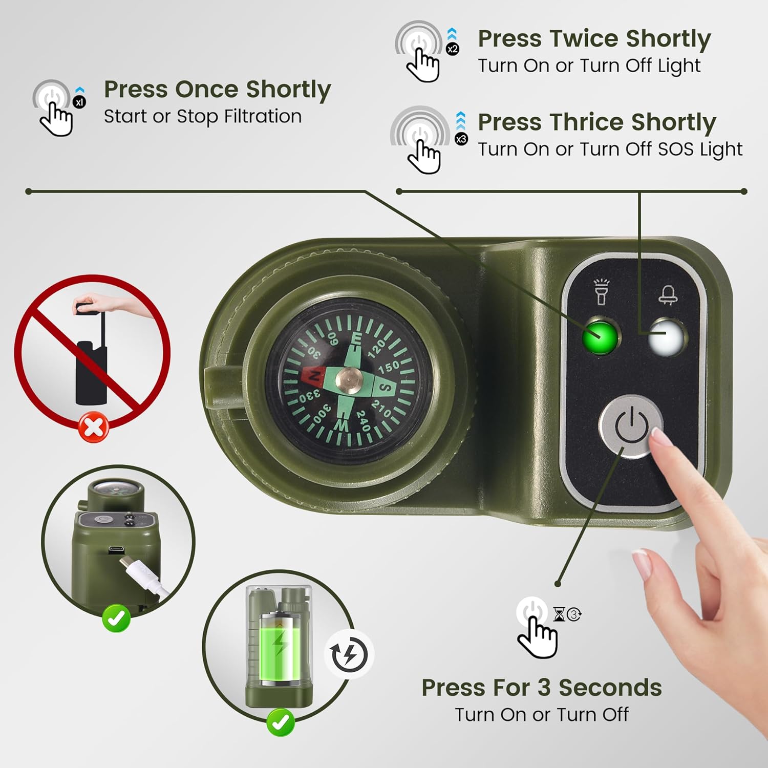 Hand-Free And Easy To Assemble: Simply assemble two tubes and press the button to replenish clean water. Electric water purifier comes with emergency lights and compass to keep you safe in outdoor.