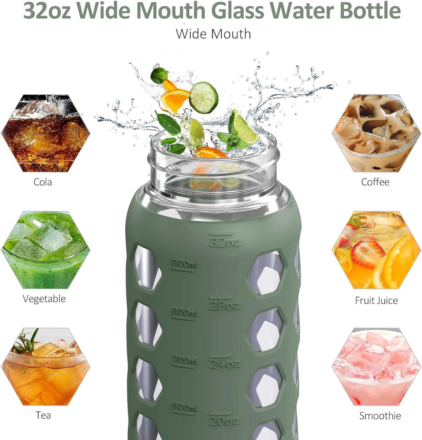 13 reviews for MUKOKO 32oz Glass Water Bottles with 2 Lids-Handle Spout Lid&Bamboo Straw Lid, Motivational Water Tumbler with Time Marker Reminder and Silicone Sleeve, Leakproof-Olive-1 Pack