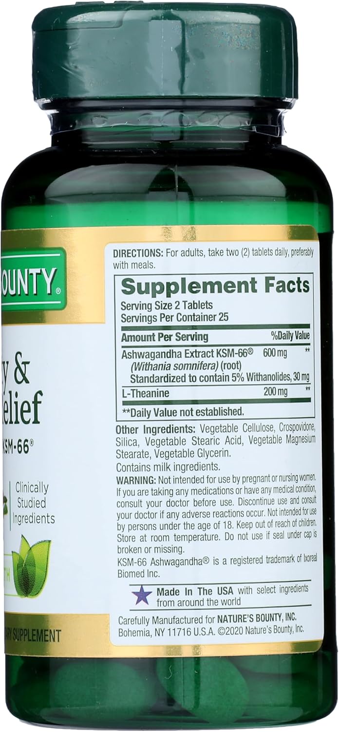 SUPPORT FROM ASHWAGANDHA: Nature’s Bounty Stress Relief tablets contain 600 mg Ashwagandha KSM-66 per serving; Ashwagandha KSM-66 is a clinically studied herbal extract that supports a healthy response to occasional stress (1)