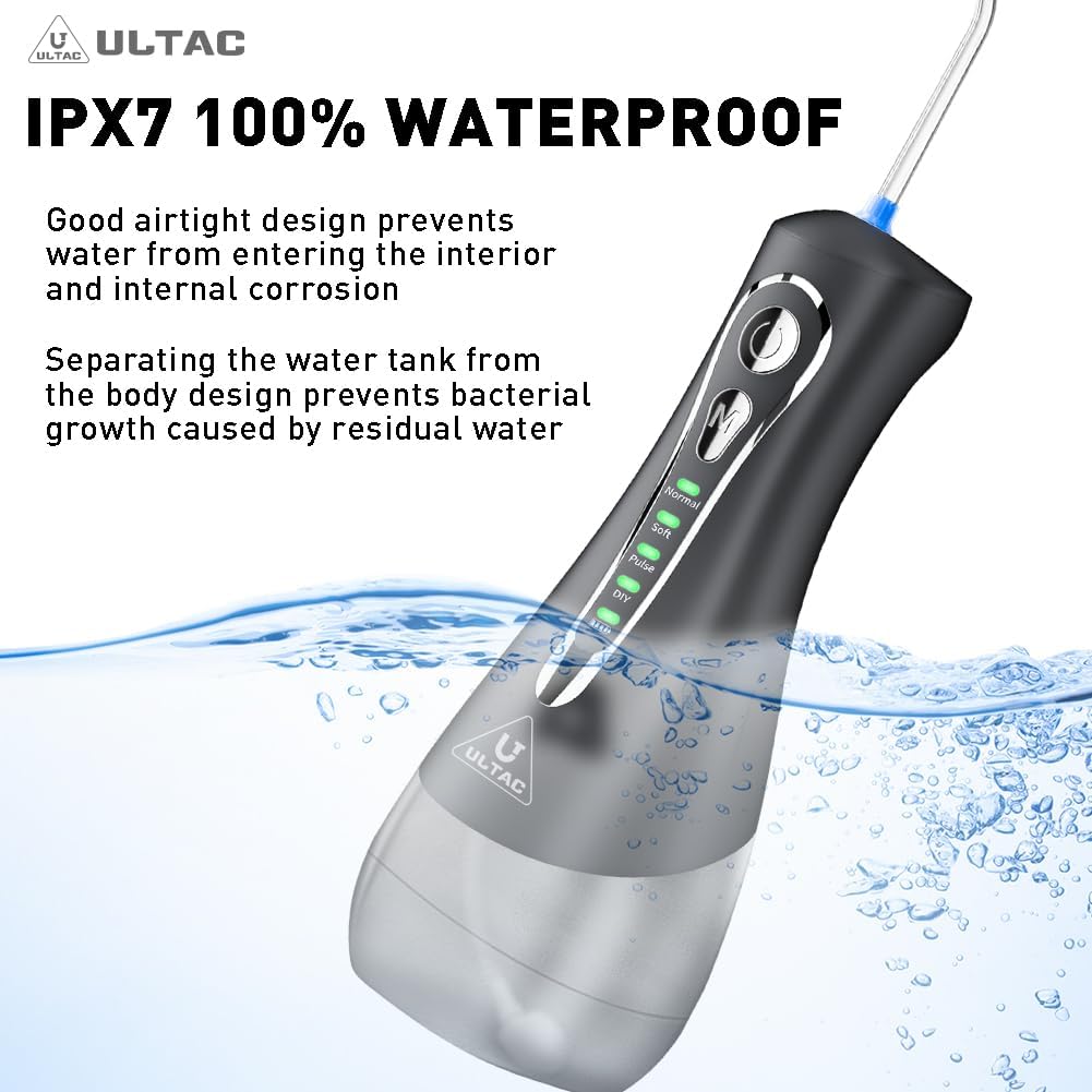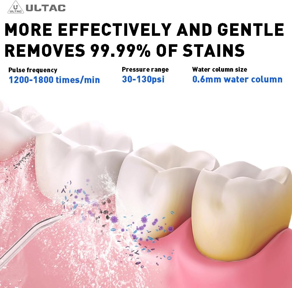Deep cleaning & whitening teeth & improving gum health. ULTAC dental water flosser offer high-frequency water pulses 1200-1800/min with 30-130 psi powerful water pressure. 0.6mm fine water flow, water deep into the teeth, this power dental flossers removes hidden oral problems, helps with bleeding gums and bad breath, and is good for orthodontic braces and bridge care.