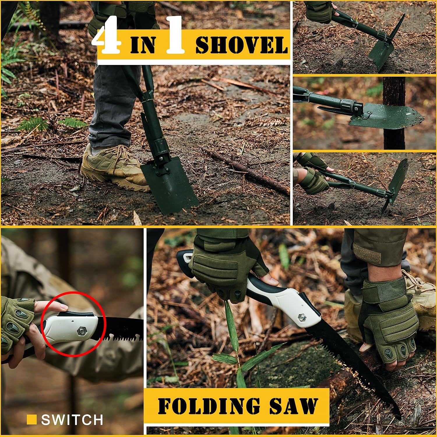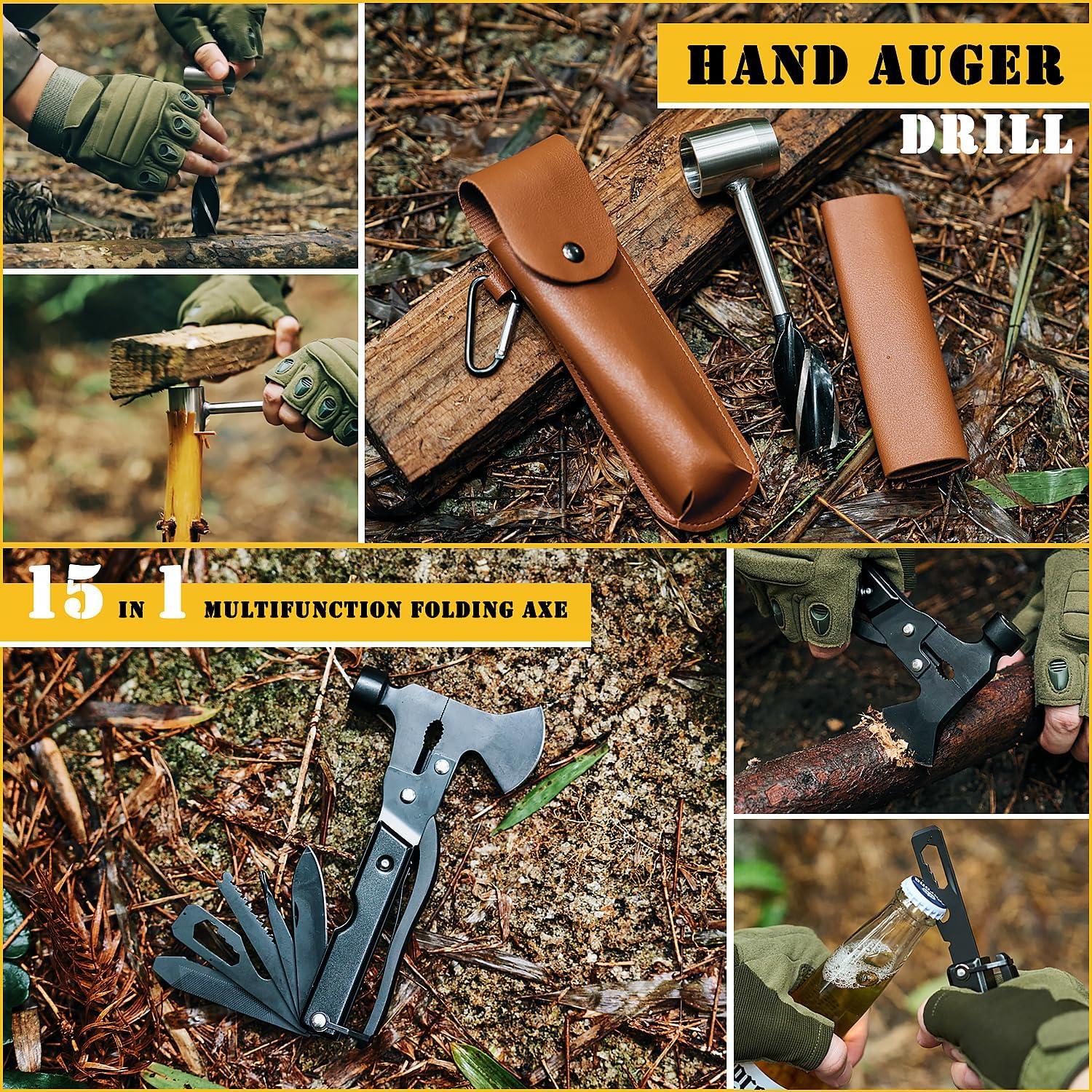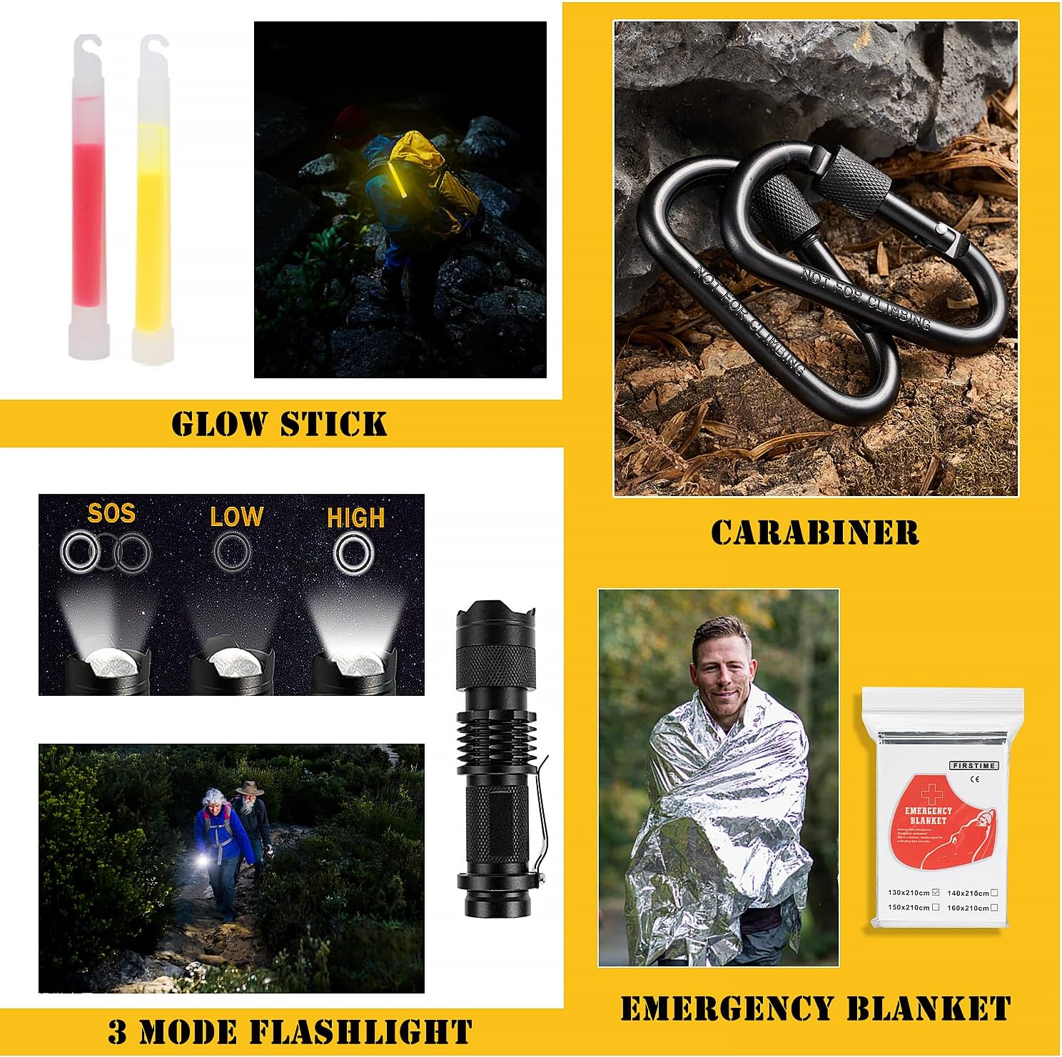 【Practical Survival Gear】This kit includes the most popular survival accessories: a multifunctional axe, a 3-mode flashlight, a carpenter’s drill, a folding saw, a multifunctional card, a survival bracelet, a whistle, a wire saw, a paracord, an emergency blanket, fire-starting tools, fishing tools, a comprehensive first aid kit, and more. All of these gears ensure that we have the basic survival essentials in the outdoors.