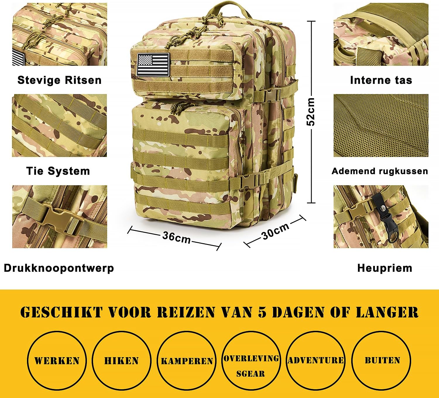 【45L Camping Backpack】The tactical backpack has multiple compartments and double-zipper closure pockets, including 2 large compartments, 2 small front compartments, and 1 back compartment. The tactical backpack dimensions are approximately 11.81″ x 19.68″ x 11.81″ (width x height x depth). The military tactical MOLLE backpack is made of high-density double-stitched 900D Oxford cloth and nylon fabric, making it durable and waterproof.